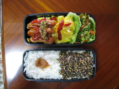 そこで今日生まれて初めてお弁当(上図参照)を自分で作ってみました。